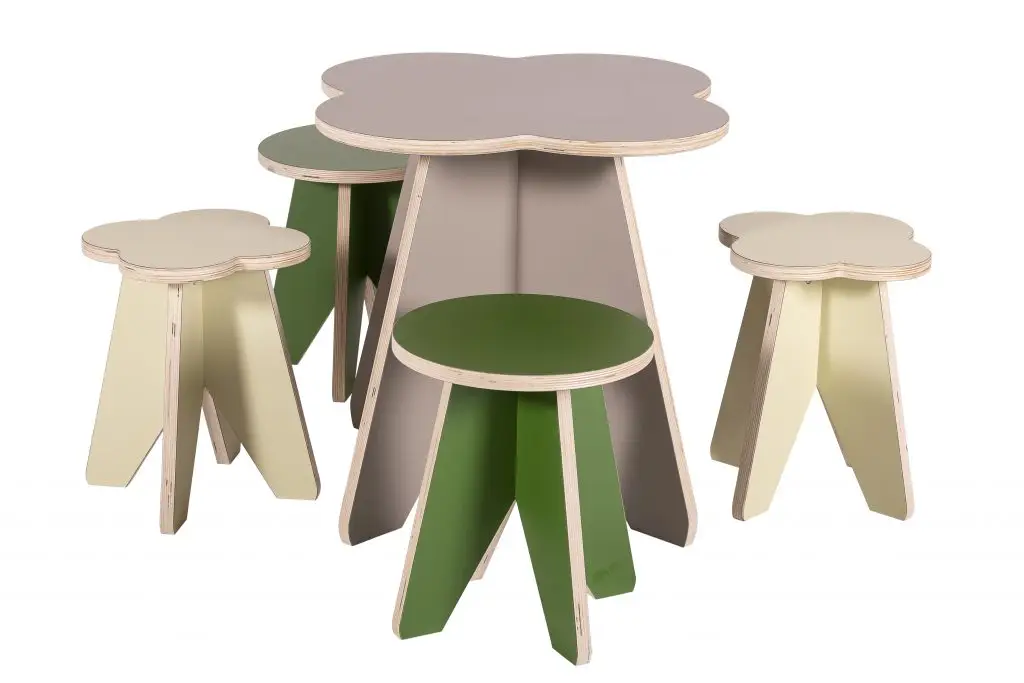 BARNEMØBLER – BORD. Skogen barnemøbler er en serie som består av 2 stoler(Blomst og Rund) og 4 forskjellige modeller på bord (Blomst, Rund, Larve og Blad). Dette skaper muligheten for en rekke kombinasjoner. Kombiner dem slik du vil med de forskjellige fargene og fasongene til du finner din egen favoritt. Møblene er laget av laminert kryssfiner.